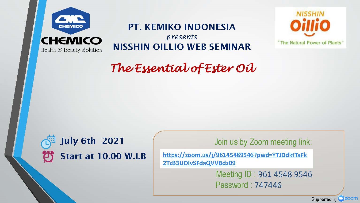 The Nisshin OilliO Group, Ltd. and the expertise from Britoncosmetech collaborated with PT. Kemiko Indonesia, Jakarta held a webinar on July 6, 2021. The topic was “The Essential of Ester Oil”.