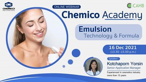 Chemico Asia Health and Beauty (CAHB) Center, a member of Chemico group held a webinar for Academy entitled "Emulsion Technology & Formula" on December 16th, 2021. Attendants were lecturers, professors and students. Ingredients and formulas related to the topic were introduced during the webinar.