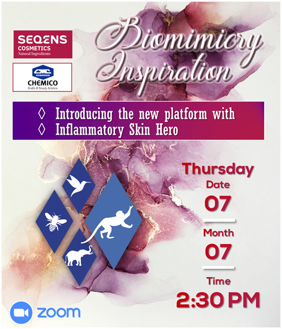 Chemico Vietnam Co., Ltd. in collaboration with Seqens SAS – our French supplier that has a strong expertise in the development and manufacturing of unique ingredients, held a webinar on July 07, 2022 with the title “Biomimicry Inspiration”. Inspired by the title, the webinar introduced a series of unique ingredients developed from advanced technology that would bring out the perfect solutions for beauty care and cosmetics.