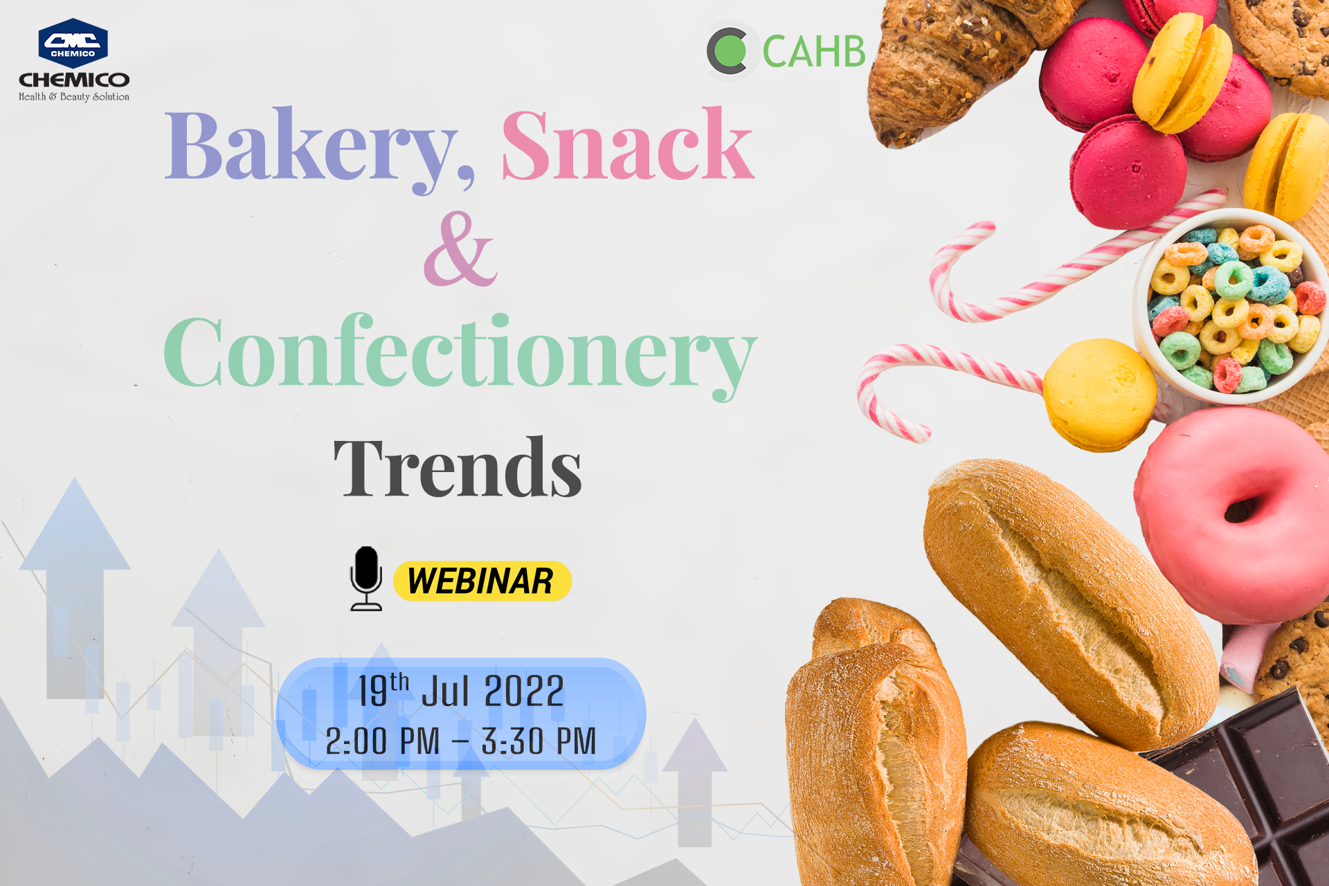 Chemico Asia Health and Beauty (CAHB) Center, a member of Chemico Group, Thailand organized a webinar entitled “Bakery, Snack & Confectionery Trends” on July 19th, 2022. Bakery, Snack & Confectionery trends, market information and global market products as well as the related ingredients were presented.