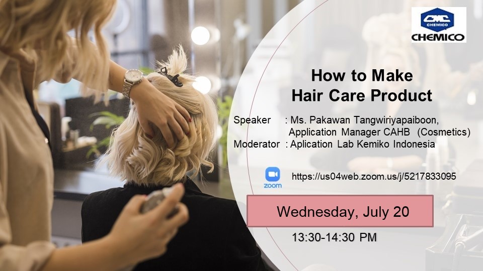 PT. Kemiko Indonesia, Jakarta Indonesia together with Chemico Asia Health and Beauty (CAHB) Center, Thailand held a webinar entitled “How to Make Hair Care Product” on July 20, 2022. The webinar introduced criteria of formulation creation, traditional formulation structure and ingredient which bring out the perfect guideline for developing hair care formulation.