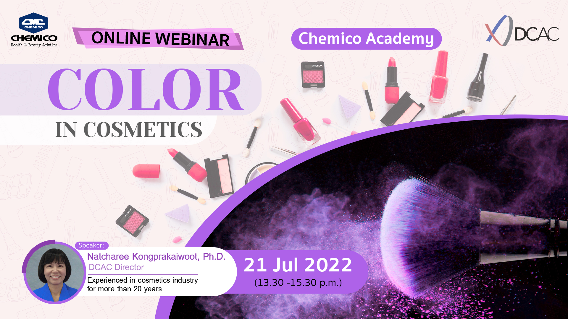 Daito Chemico Asia Color Cosmetics (DCAC) Center, a member of Chemico group, Thailand held a webinar for Academy entitled "Color in Cosmetics" on July 21, 2022. Attendants were lecturers, professors and students. Color theory, Type of colorant, Factor affecting color and Color matching were presented during the webinar.