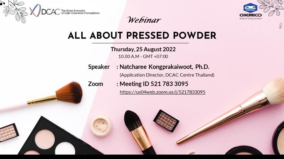 On August 25, 2022, PT. Kemiko Indonesia, Jakarta Indonesia in Collaboration with Daito Chemico Asia Color Cosmetics (DCAC) Center held a webinar entitled “All about Pressed Powder”. This webinar talked about basic knowledge and formulation tips for pressed power products such as two-way cake, blush on, etc. During the webinar, many customers gave nice responses by questioning, and hopefully this would be a good start for them.