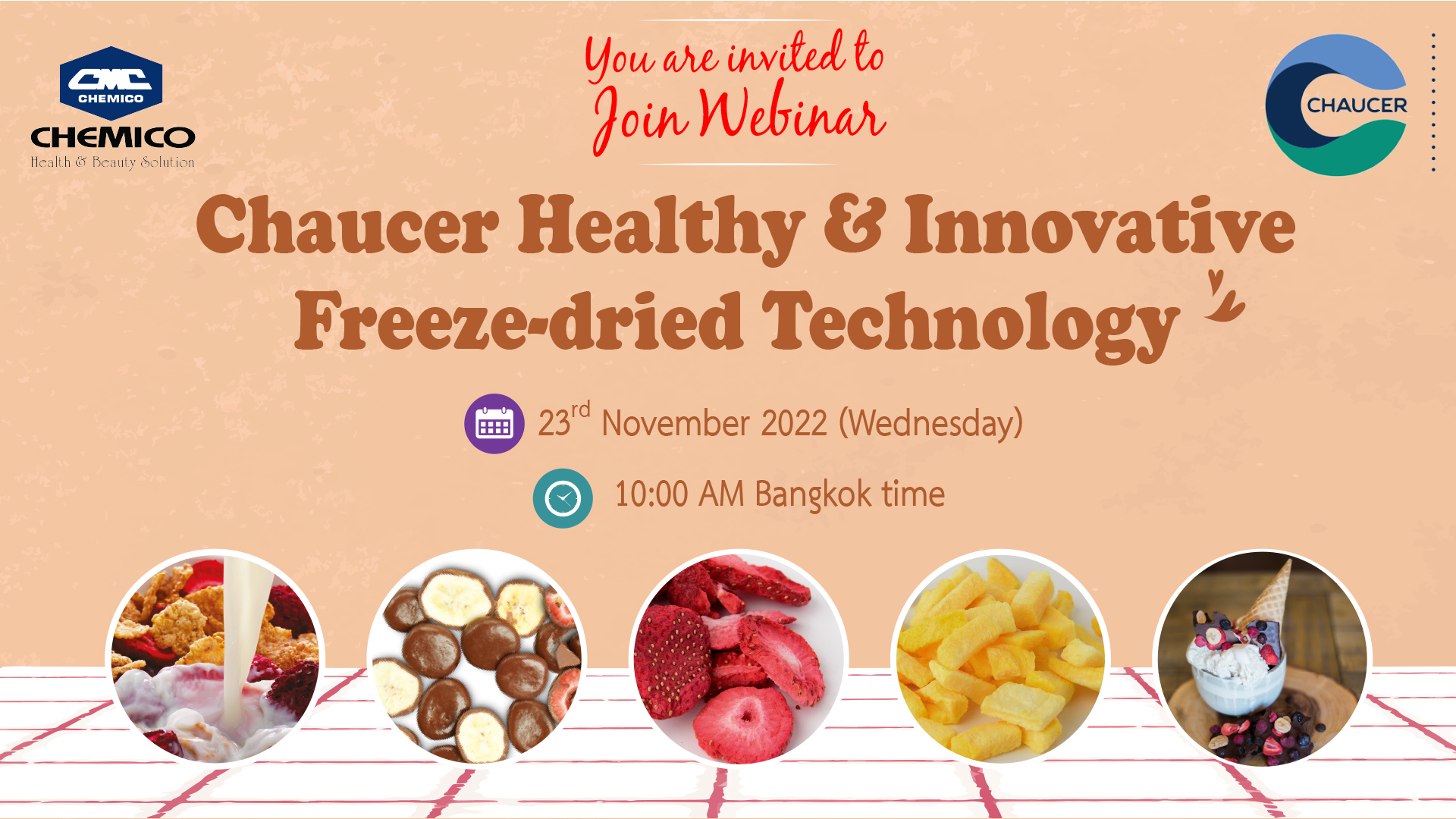 Chaucer Group, China in collaboration with Chemico Inter Corporation Co., Ltd., Bangkok held a webinar entitled “Chaucer Healthy & Innovative Freeze-dried Technology” on November 23rd, 2022. The webinar provided innovation and baking products, market trend with examples of market product as well as the related applications. The information is very useful in the development of new products in the field of beverage, dietary supplement, jelly strip, protein bar, chocolate, ice cream, cream soup, etc.