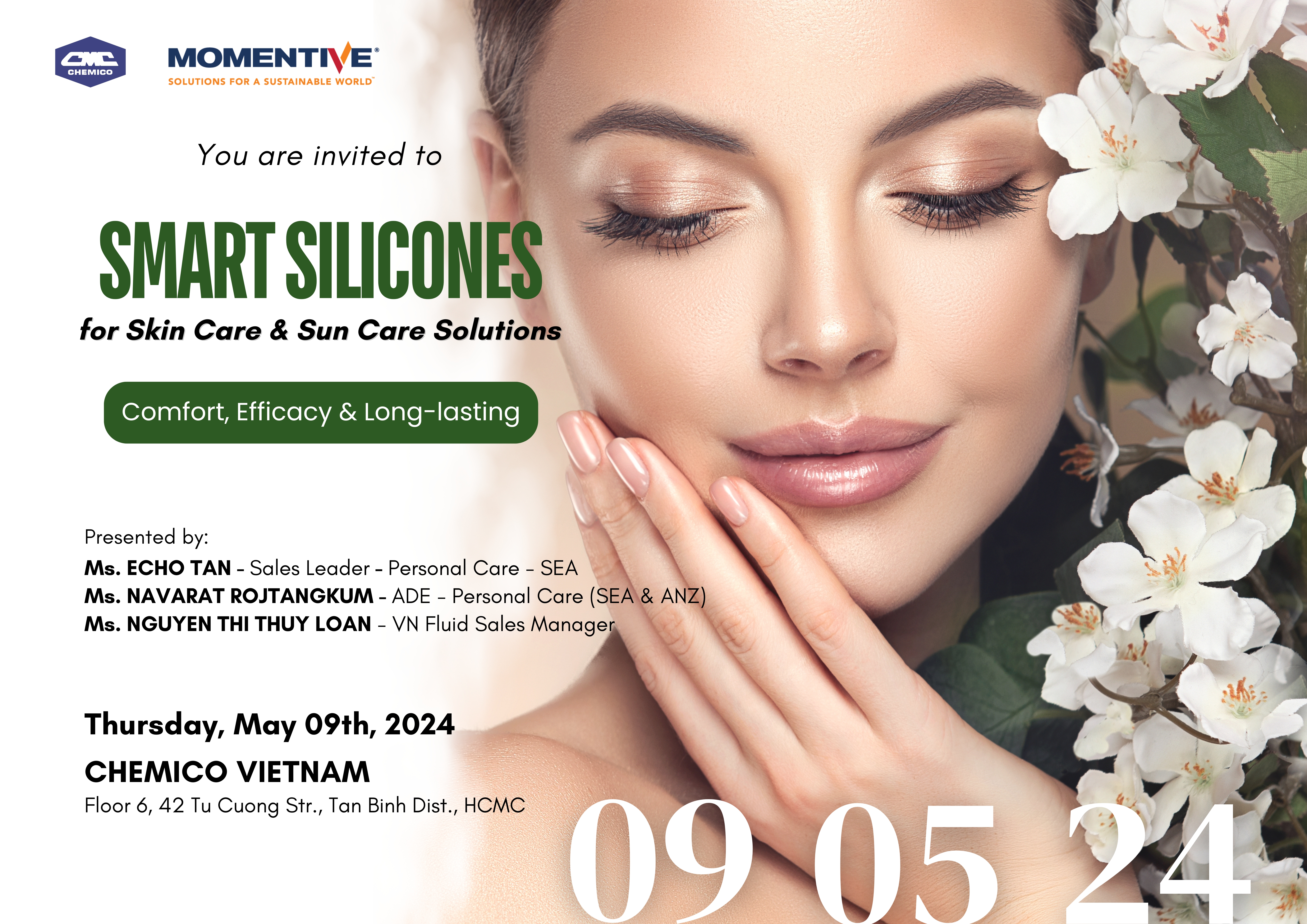 SMART SILICONES for Skin Care & Sun Care Solutions – Comfort, Efficacy & Long-lasting (May 9th, 2024): The seminar updated the latest trends for skin care and sun care as well as introduced the formulations co-developed by Momentive and Chemico Vietnam Application teams. The ingredients functioning as Film former, Spreading / Dispersing aid, SPF booster, Emulsifier, Rheology modifier and Sensory enhancer were introduced. All attendees could experience these advanced ingredients and did the trials for Lip oil and Premium hand cream in the workshop part.