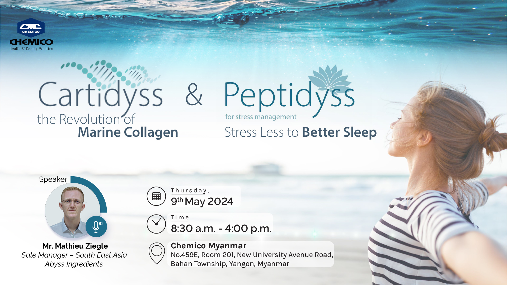 Abyss Ingredients, France in collaboration with Chemico Myanmar Co., Ltd. organized the very first seminar of 2024 on May 9th, 2024 at Chemico Myanmar Application center. The topic was “Cartidyss: The Revolution of Marine Collagen & Peptidyss for Stress Management: Stress Less to Better Sleep”. The seminar was about Abyss products: Cardityss and Peptidyss including product details with clinical and research data. Formulations and prototypes were presented to the customers as well.