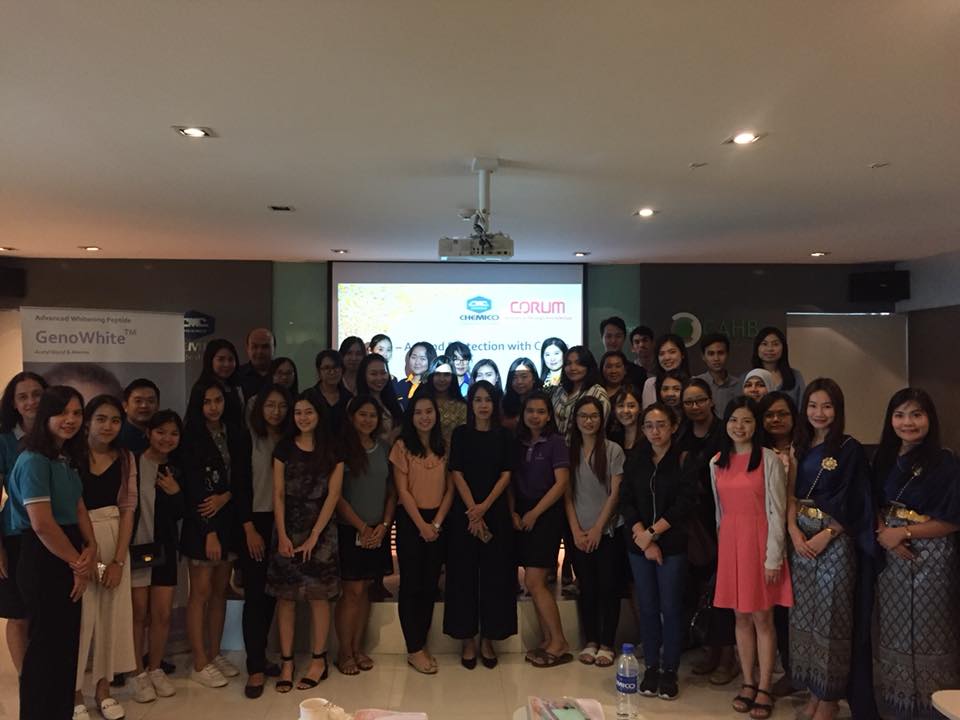 Corum Inc., Taiwan in collaboration with Chemico Inter Corporation Co., Ltd. held a seminar entitled “All around protection with Corum” on May 8, 2018 at CAHB center, Thailand. We presented cosmetic trend 2018 and provided the interesting ingredients to follow the trend. The seminar also introduced a new anti-acne ingredient, ApotacTM and lab trials were included.