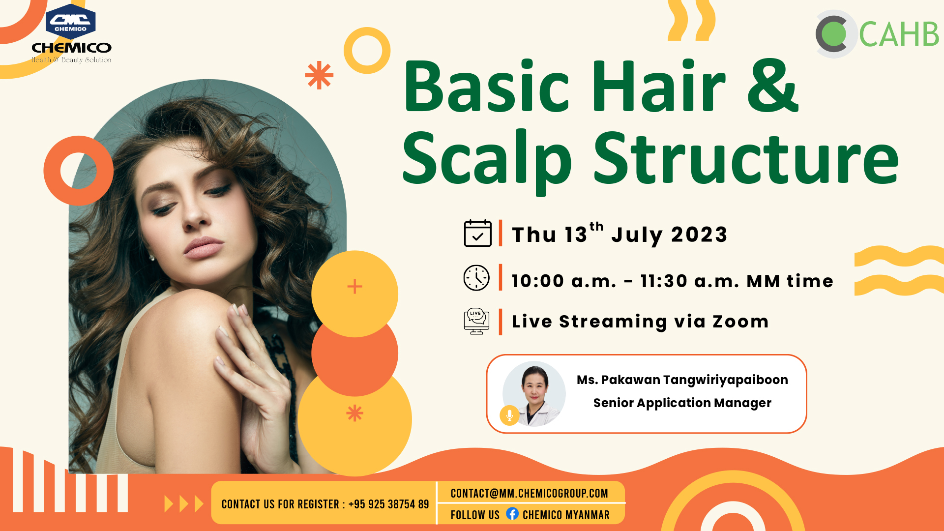 Chemico Myanmar Co., Ltd. in collaboration with Chemico Asia Health and Beauty Center organized a webinar entitled “Basic Hair & Scalp Structure ” on July 13th, 2023. During the webinar, we shared about hair & scalp structure and information of raw materials for hair and scalp care. Attendees were interested and participated in poll and survey as well as Q&A sections as well. We will distribute samples and documents to the customers upon request after the webinar.