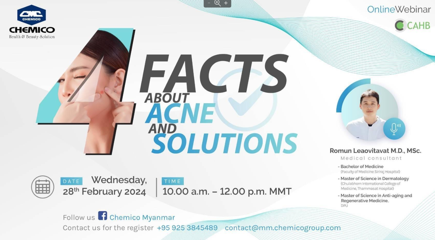 Chemico Myanmar Co., Ltd. organized an interesting webinar under the topic “4 Facts about Acnes and Solutions“ on February 28, 2024. The main speaker is our medical consultant, Dr. Romun Leaovitavat. The webinar presented about facts of acnes and main ingredients for recovery mask, toner, daily serum, spot gel and scar treatment. Formulations, formulation tips and the related raw materials were also included.