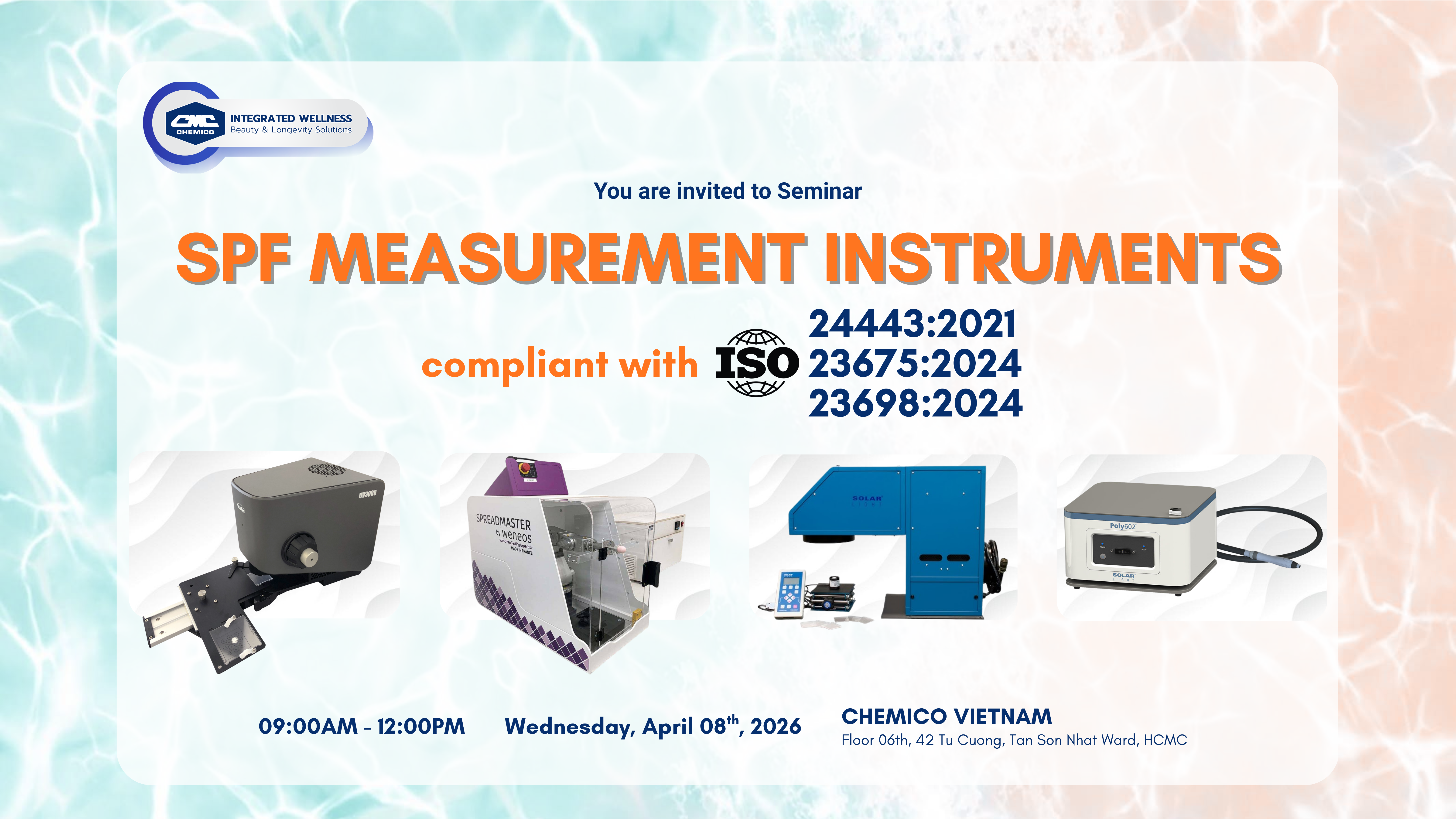 On April 08th, 2026, Chemico Vietnam Co., Ltd. held the seminar entitled “SPF Measurement Instrument compliant with ISO 24443:2021, 23675:2024, 23698:2024”. This is our very first and valuable seminar focusing on introducing advanced SPF measurements for sunscreen products, along with the latest updates on ISO standards for sun protection evaluation. The event featured presentations from Chemico representatives, including Mr. Patrick (Sang Seok) Lee – Sales & Marketing Director (PT. Chemico Surabaya, Surabaya Indonesia), and Mr. Frederick K. Paulsen – Assistant Technical Product Manager (Chemico Inter Corporation Co., Ltd., Bangkok, Thailand). Overall, the seminar provides a valuable opportunity for attendees to update technical knowledge, explore innovative solutions, and expand professional networks within the industry.